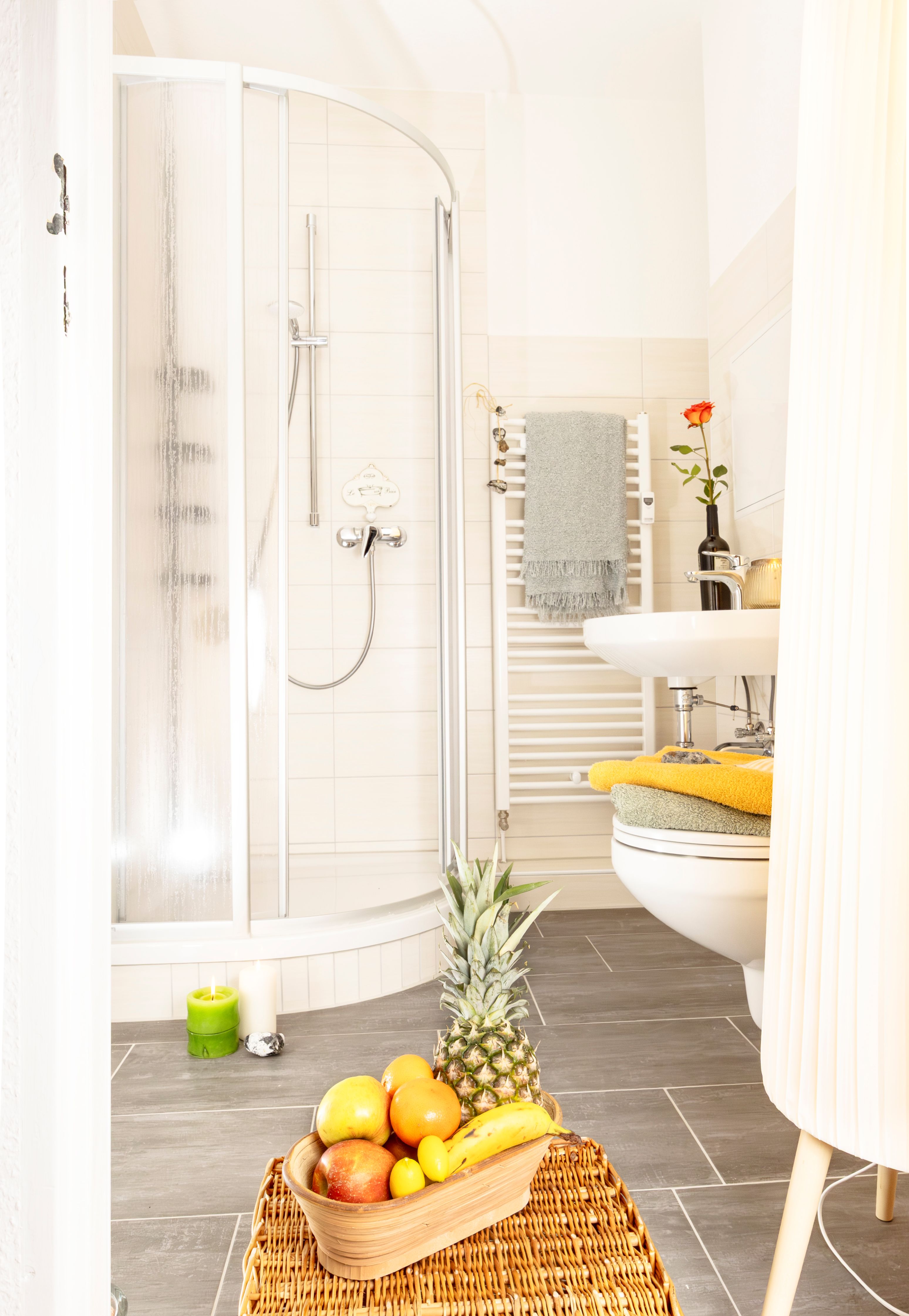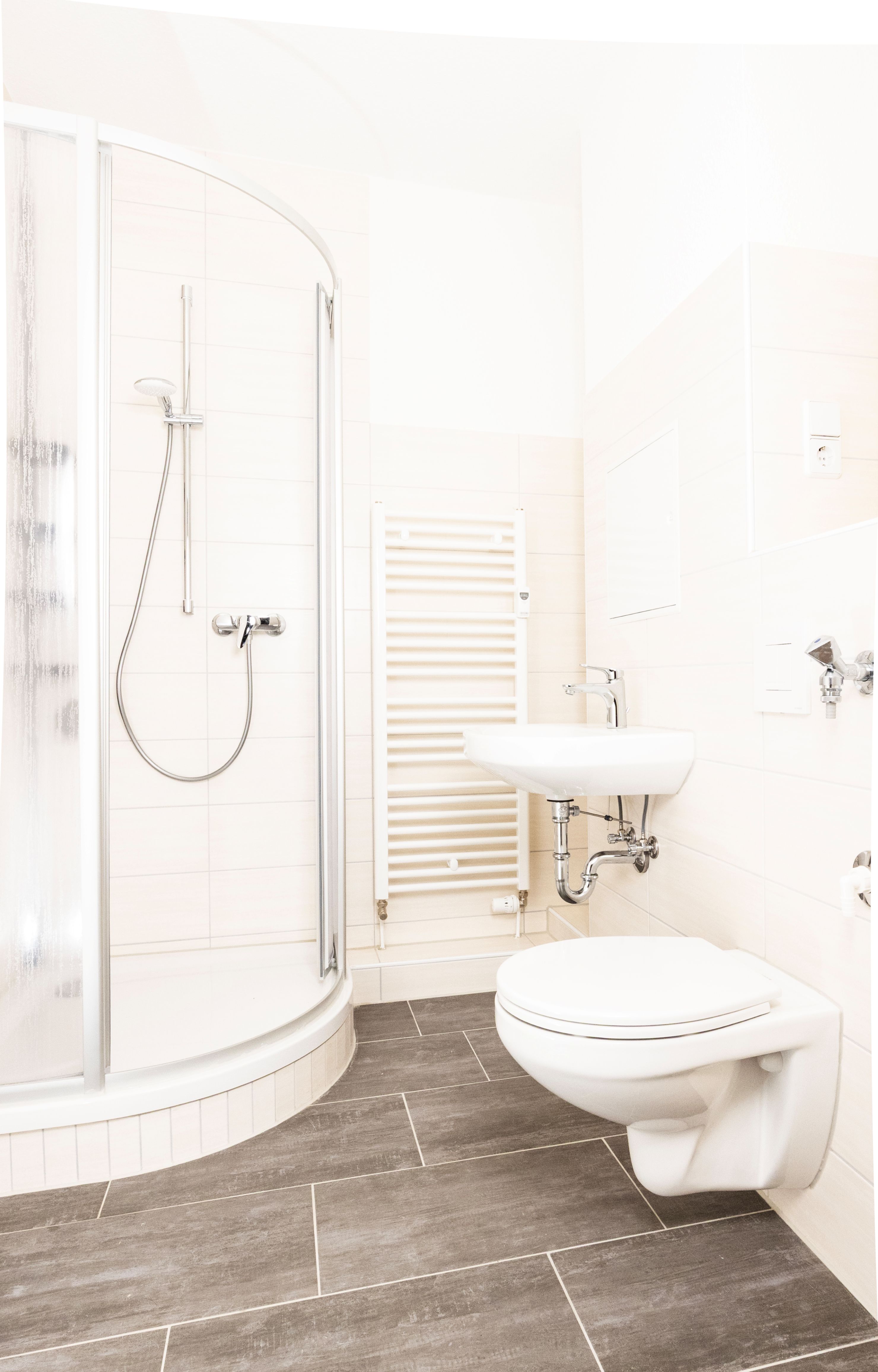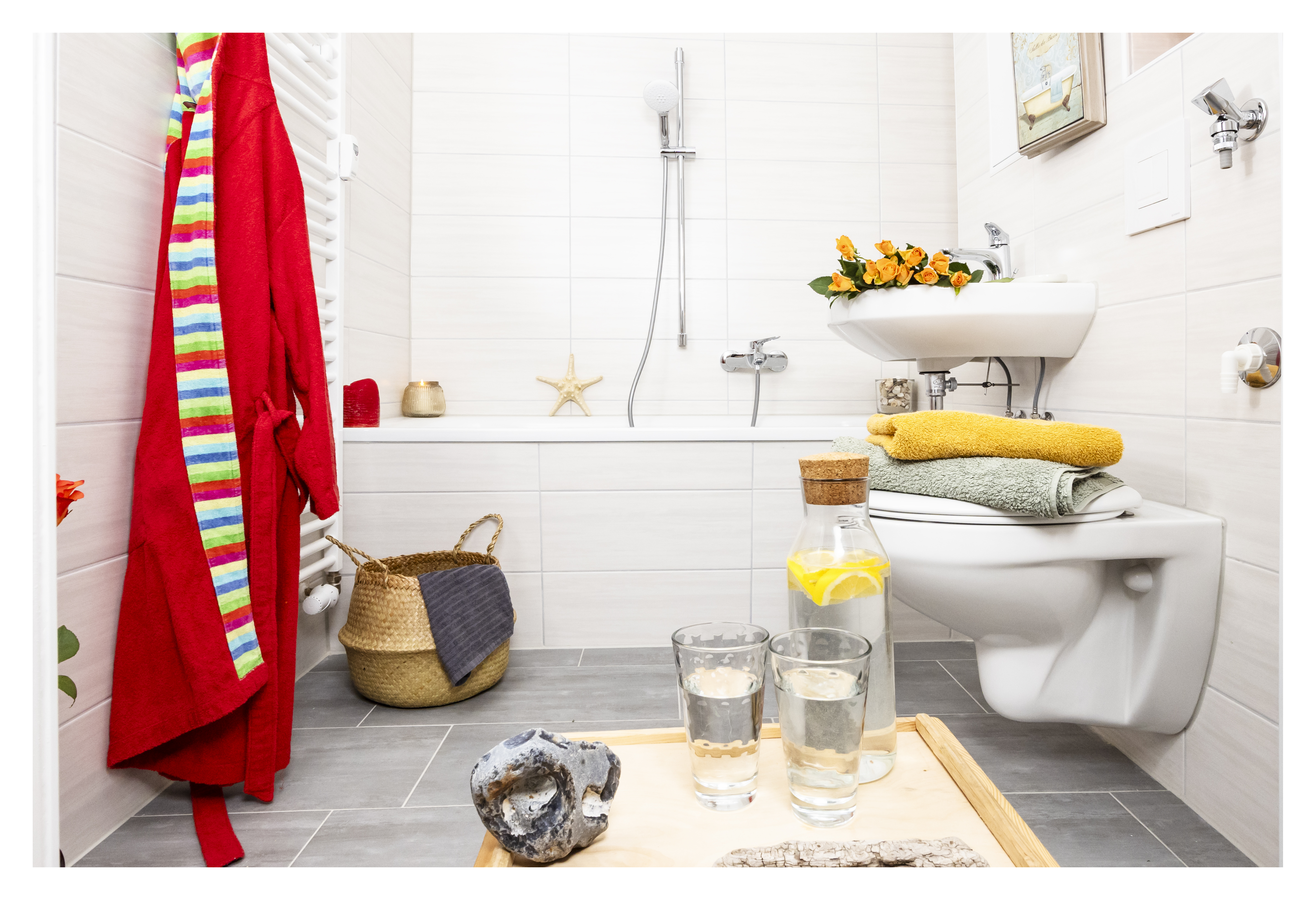 Innenliegendes, modern gefliestes Badezimmer mit Wannen- bzw. Duschbad möglich.