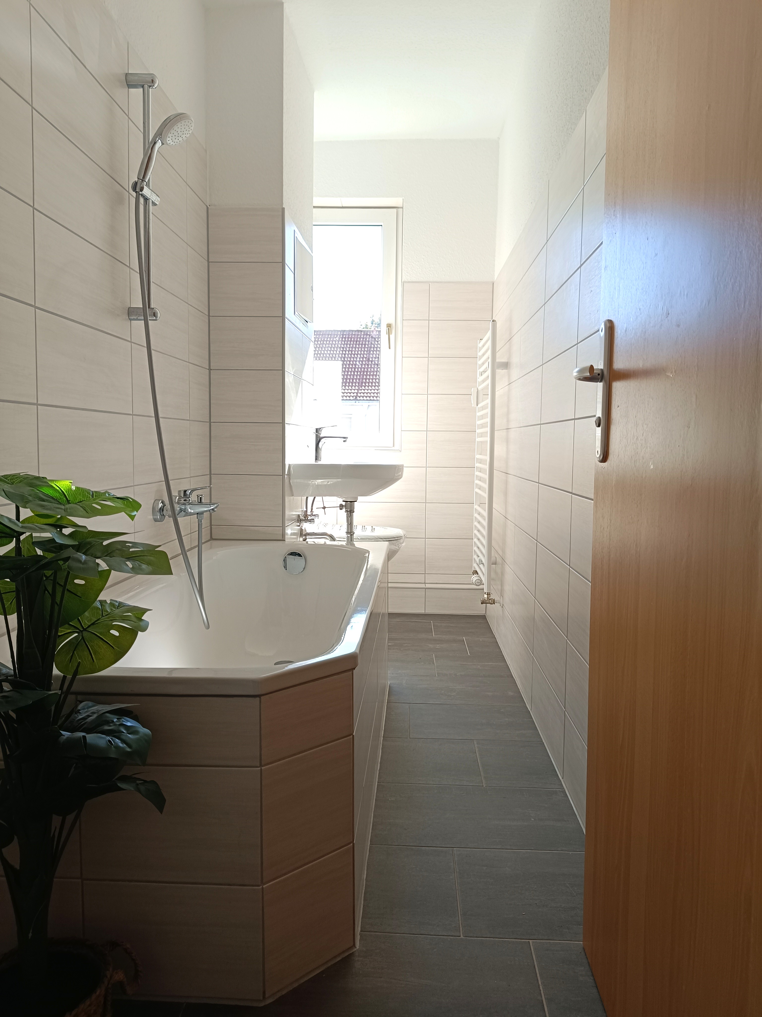 Innenliegendes, modern gefliestes Badezimmer mit Wannen- bzw. Duschbad möglich.